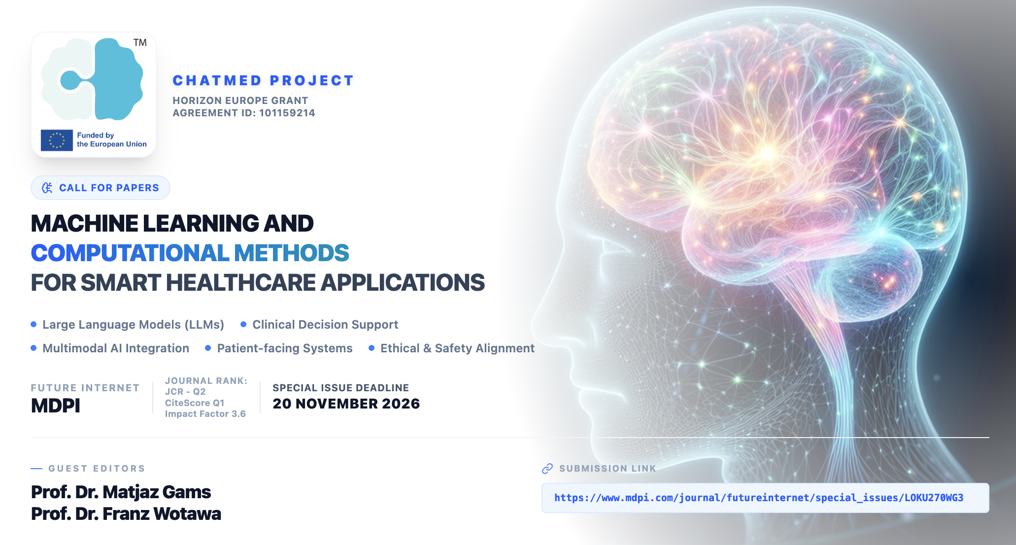 We are pleased to announce a new Special Issue dedicated to advancing AI-driven smart healthcare systems, organized within the framework of the ChatMED Project (Horizon Europe, GA 101159214).